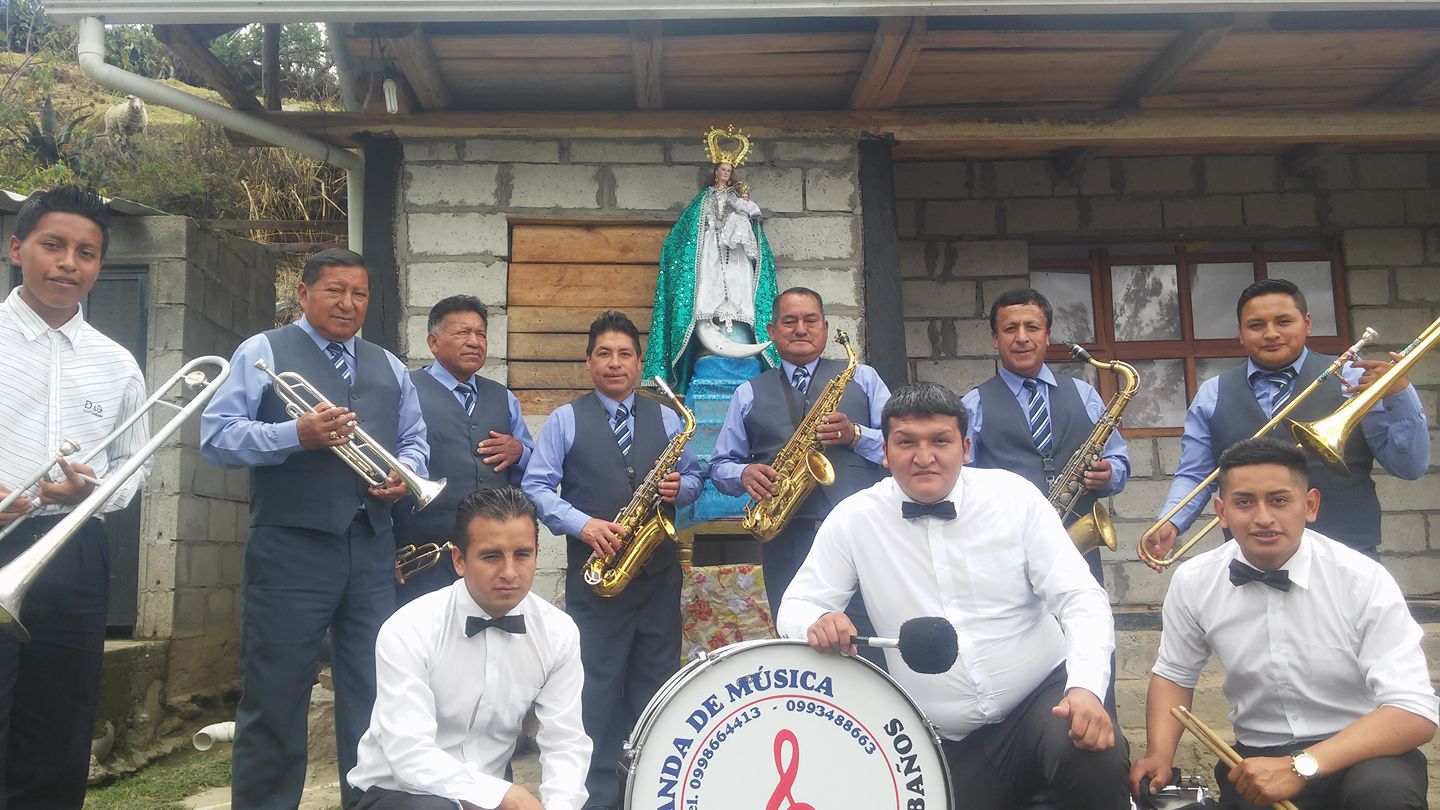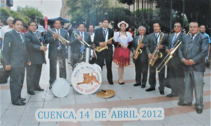 De izquierda a derecha: Luis Loja Vivar (trompeta 1), Juan Morocho Sinche (trompeta 2), Francisco Illescas (saxofón alto), Santiago Chamba Zhumi (bombo), Carlos Pesántez Balarezo (director y saxofón tenor), Henry Guamanrrigra Loja (trombón) y Damián Uzhca Atancuri (caja).